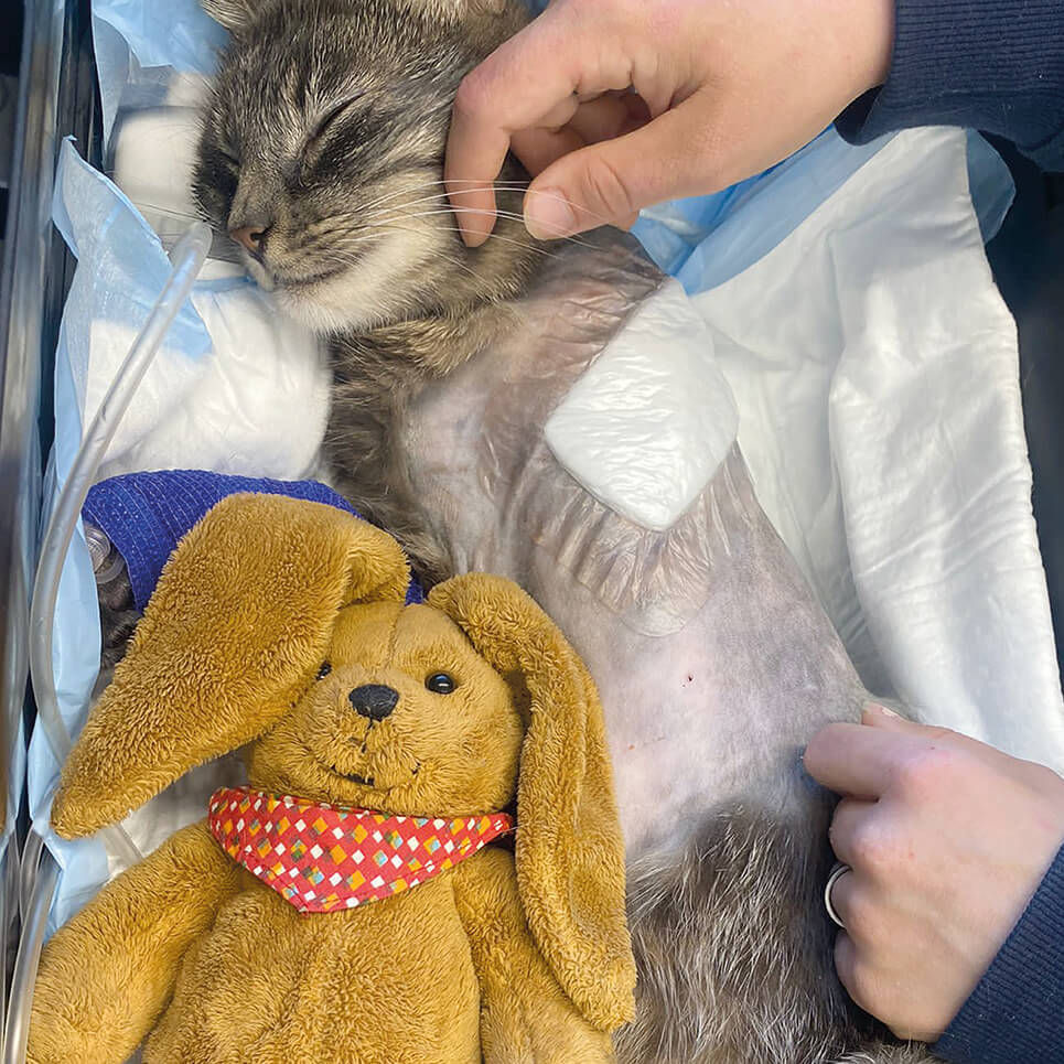 Das Telefongespräch mit der Besitzerin von Mausi war schockierend. Ihre Katze wurde schwer verletzt und stark blutend aufgefunden. Frau H. hat Mausi sofort in die nächste Tierklinik gebracht. Mehrere Röntgenbilder gaben Aufschluss über die Schwere der Verletzungen. Es sah so aus, als wäre Mausi von einem Mähdrescher erfasst worden. Zum Glück wurden weder innere Verletzungen noch Verletzungen im Schädelbereich vorgefunden. Das Klinik-Team hat Mausi sofort operiert. Die linke Schulter war so stark beschädigt, dass das ganze linke Vorderbein amputiert werden musste. Das rechte Hinterbein war gebrochen und wurde geschient. Die linke Hinterpfote wurde angeschnitten und musste wieder zusammengesetzt werden. Glück im Unglück: schon bald wird Mausi wieder auf ihren drei Beinen stehen und ihr Katzendasein voll ausleben können.